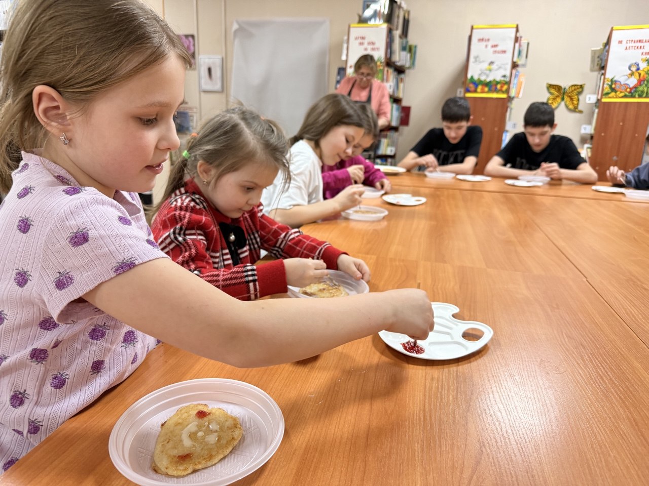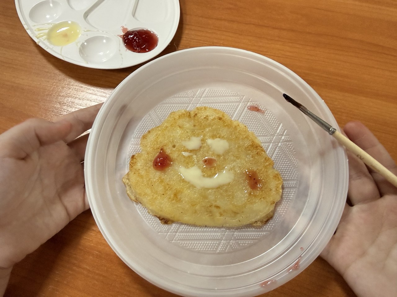 Наши юные кулинары попробовали себя в роли настоящих поваров-профессионалов: приготовили ароматные яблочные оладьи и превратили их в настоящие произведения искусства, украсив яркими красками из натуральных ингредиентов — домашнего варенья и сладкой сгущёнки.