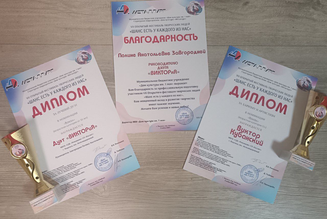 8 ноября в городском округе Подольск состоялся VII открытый фестиваль творческих людей «Шанс есть у каждого из нас», в котором  принял участие Участник губернаторской программы «Активное долголетие» Виктор Кубанский, семейный дуэт ВИКТОРиЯ (руководитель Завгородняя Полина Анатольевна) и солистка студии восточного танца «Джаннат» Ксения Лидер (руководитель Филиппова Галина Николаевна) Дома культуры «Рассвет» п. Железнодорожный МБУК СДК «Романцево».